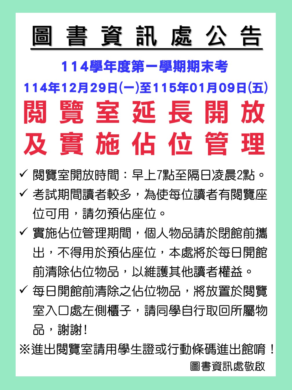 年12月29日(一)至115年01月09日(五)閱覽室延長開放及實施佔位管理